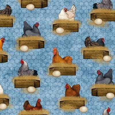 Boneful Fabric Fq Cotton Quilt Blue Yellow Hen Chicken Coop Chick